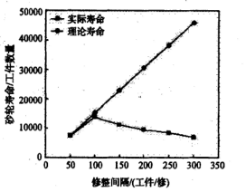 從下圖可以看出,當修整間隔為50件,修時,砂輪理論壽命最大值為7 650件,砂輪的實際壽命為7 480件,砂輪壽命的實際值和理論值比較接近,說明砂輪損耗正常,砂輪的消耗基本都是修整消耗。