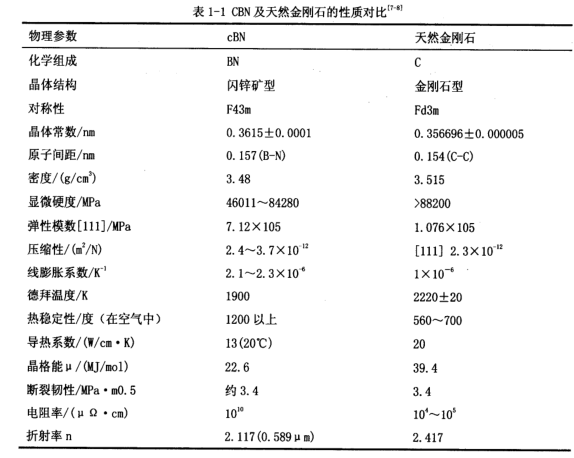 CBN與金剛石在性能上有很多相似之處(見表1一1),與金剛石相比,CBN的硬度和導熱系數(shù)較低,一方面是因為B-N之間的結(jié)合具有離子性(約22%);另一方面是由于該離子熱激發(fā)時產(chǎn)生稍微大的晶格自由度,提高了CBN向六方氮化硼逆轉(zhuǎn)變所需的溫度,使CBN顯示出比金剛石高的耐熱性和大的沖擊熱阻。