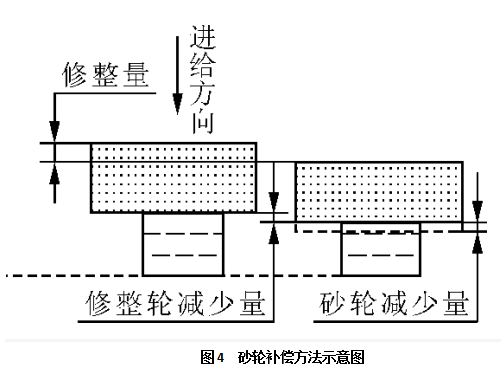 分析砂輪修整的過程,是兩個(gè)磨具的相互磨削,不僅砂輪磨料厚度會(huì)減小,修整輪的磨料厚度也會(huì)減少,是一個(gè)綜合作用的結(jié)果。因此,采用多次試驗(yàn)的方法,確定了砂輪修整的 補(bǔ)償方法。