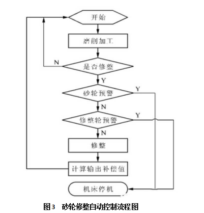 在磨削加工中,砂輪的磨損狀態(tài)是影響磨削質(zhì)量的一個(gè)重要因素。該數(shù)控工具磨床可在刀片加工磨削的全過程中對砂輪狀態(tài)進(jìn)行實(shí)時(shí)監(jiān)測。根據(jù)加工刀片尺寸和材料的不同,需要磨削去除的體積和磨削時(shí)間也不同。綜合考慮各個(gè)因素,設(shè)定自動(dòng)修整的間隔。通過對砂輪磨削刀片次數(shù)計(jì)數(shù),并實(shí)時(shí)的將其與系統(tǒng)設(shè)定的修整間隔比較。當(dāng)磨削次數(shù)達(dá)到設(shè)定的修整間隔次數(shù)時(shí),在 NC 程序中自動(dòng)調(diào)用修整模塊,實(shí)現(xiàn)砂輪的自動(dòng)修整。為了保證機(jī)床運(yùn)行安全,該控制方法還加入了對砂輪壽命和修整輪壽命的實(shí)時(shí)監(jiān)控。只要檢測到本次修整將可能導(dǎo)致砂輪或修整輪到達(dá)預(yù)警厚度,機(jī)床將自動(dòng)發(fā)出報(bào)警信號(hào),停機(jī)等待人工處理。如果砂輪和修整輪均未到達(dá)報(bào)警厚度,則修整順利進(jìn)行。修整結(jié)束后,通過數(shù)據(jù)處理,輸出砂輪修整后的補(bǔ)償值。砂輪修整自動(dòng)控制流程如圖 3 所示