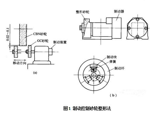 力按壓CBN砂輪時,整形砂輪則隨CBN砂輪一起轉(zhuǎn)動。另外,整形砂輪還做往復(fù)移動,以一定的滾壓力進(jìn)行修整。在整形砂輪軸上安裝制動器的目的是為了使整形砂輪與CBN砂輪間產(chǎn)生相對速度。圖1(b)所示為制動器示意,制動塊因受彈簧力作用向制動環(huán),依靠摩擦作用降低整形砂輪速度。整形砂輪與CBN砂輪的相對速度越大,整形效率越高。