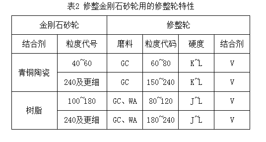這種方法同時也可以用于修銳,是常用的一種修整方法。可用碳化硅、剛玉油石修整超硬砂輪,也可用動力驅(qū)動金剛石、碳化硅或剛玉砂輪來修整超硬砂輪。修整金剛石砂輪時,修整輪的特性見表2。修整CBN砂輪的修整特性也可參考表2選取,只是其硬度應(yīng)取得略低一些。