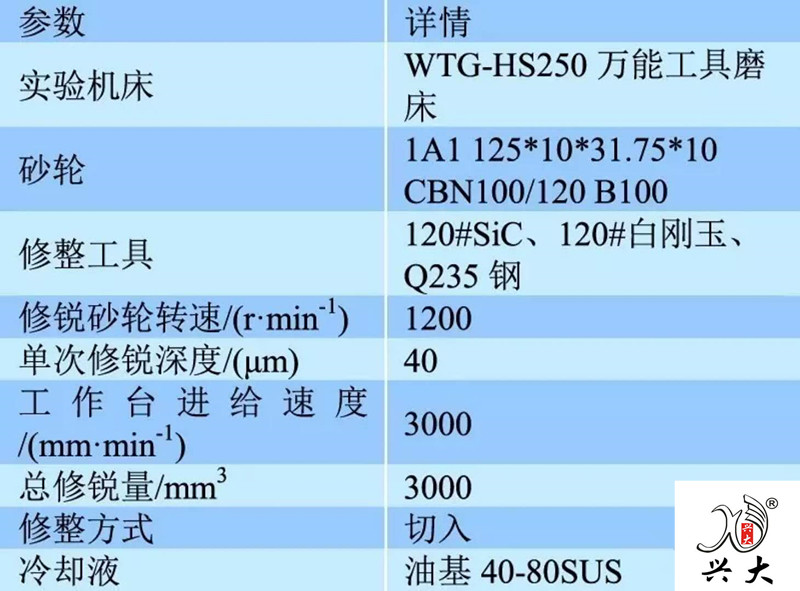 圖2 為樹脂結(jié)合劑CBN砂輪修銳試驗圖,在WTG-HS250數(shù)控萬能工具磨床上進行砂輪修銳試驗。把修整工具固定到工作臺上進行平面磨削修銳,為消除上次修銳結(jié)果的干擾,在每次修銳前均采用同粒度的陶瓷金剛石工具進行整形,首先去除一定量的砂輪表面,直到砂輪圓周跳動<3μm為止,然后分別采用碳化硅、白剛玉和Q235鋼對100/120樹脂結(jié)合劑CBN進行修銳,修銳條件如表1所示,三種修銳工具材料硬度與CBN磨料硬度對比見表2。