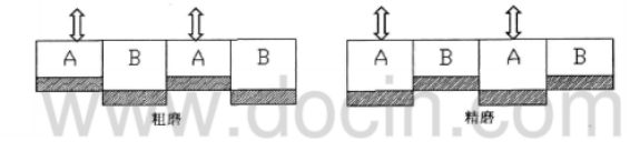 近年來,學(xué)者們?yōu)榱颂岣呒庸ば剩?jié)省生產(chǎn)時間,對砂輪的結(jié)構(gòu)作了一些創(chuàng)新設(shè)計。日本三菱公司為改善硅片的平面度,在磨粒層上設(shè)立切縫,并采用花瓣型磨粒層,從而改善了磨削過程中硅片中心部分的冷卻效果,提高了砂輪的使用壽命。德國某公司研制了如下圖所示的牙形排列的伸縮式組合砂輪結(jié)構(gòu),A、B分別是細(xì)粒度和粗粒度砂輪塊,通過砂輪塊A的伸縮實現(xiàn)精磨和粗磨,相應(yīng)提高了硅片的加工效率和加工精度。