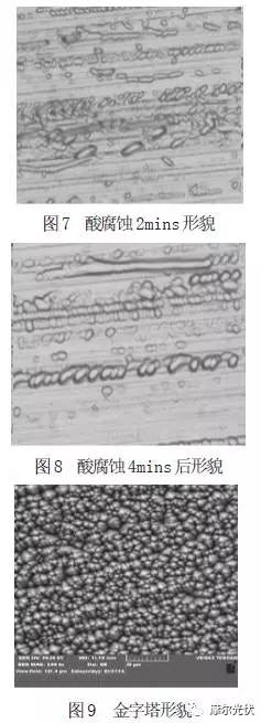 嘗試在酸腐蝕體系 HF 17% - HNO3 50% (體積濃度),溫度7~ 9℃,反應(yīng)時(shí)間 2mins、4mins,目的優(yōu)先腐蝕該金剛石線單晶切片表面斷裂損傷處,水洗后在單晶常規(guī)堿制絨體系中進(jìn)行金字塔生長(zhǎng)(如圖 7,8,9)。