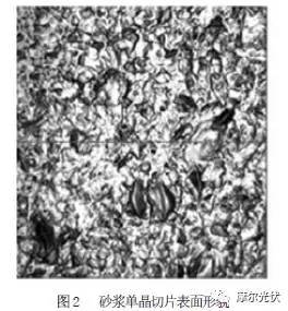 現(xiàn)國際光伏行業(yè)晶體硅片的切割方式主要有兩種。一種是砂漿切割,即利用涂有碳化硅和油漿的多根不銹鋼細(xì)鋼絲(SW) 絲環(huán)繞在驅(qū)動(dòng)輪和緊張輪上高速轉(zhuǎn)動(dòng),以聚乙二醇和碳化硅微粉為主體的磨削漿料高速帶入切割區(qū)域并對(duì)磨料施加載荷,磨料對(duì)硅料進(jìn)行磨削切割。另一種是金剛石線(DW) 切片,即采用電鍍或樹脂固定的方法將金剛石顆粒鑲嵌在不銹鋼絲上,這種不銹鋼絲高速運(yùn)轉(zhuǎn)以一定的壓力對(duì)硅料進(jìn)行磨削切割。從電池制作工藝角度比較,砂漿切割對(duì)硅片表面摩擦斷裂損傷劇烈,會(huì)使硅片表面出現(xiàn)較多小而不規(guī)則凹坑(如圖 1),容易導(dǎo)致后續(xù)清洗制絨工藝復(fù)雜且控制不穩(wěn)定,金字塔絨面變化范圍大,單片金字塔絨面均勻度差,成核率低。