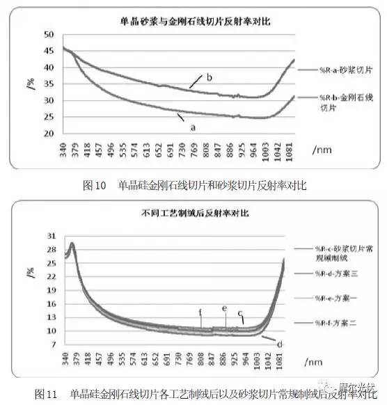 對(duì)各工藝制絨后硅片用HITACH公司的D- 4100 球型積分測(cè)試儀測(cè)試反射率(如圖 11),結(jié)果證明方案三反射率最低。