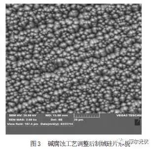 目的在不影響生產(chǎn)產(chǎn)量的情況下提高金剛石線切片的腐蝕速率以有效去掉硅片表面損傷層,并能形成大小良好、成核密度良好的金字塔(如圖 3)。其表面線痕仍較明顯。